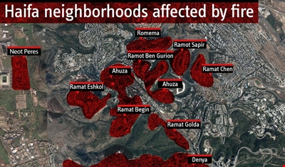 موقع صحيفة يديعوت أحرونوت أشار إلى أنّ حالة الطوارئ أُعلنت في مدينة حيفا، وأنّ أكثر من 350 عنصر إطفاء حاولوا مواجهة الحرائق، فيما تم نشر أكثر من مئة سيارة إطفاء للسيطرة على النيران التي تهدّد ثالث أكبر مدينة تخضع للسلطات الإسرائيلية.