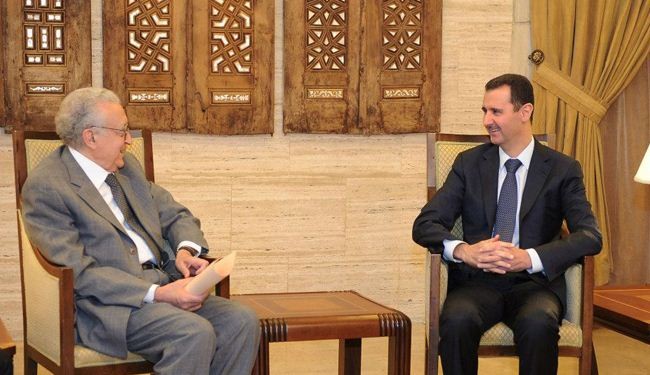 أكد الرئيس السوري بشار الاسد خلال لقائه المبعوث الاممي الاخضر الابراهيمي، أن “وقف دعم الارهابيين والضغط على الدول الراعية هو الاساس لتهيئة الظروف المواتية للحوار ووضع اليات واضحة لتحقيق الاهداف المرجوة منه”، مشددا على أن “الشعب السوري هو الجهة الوحيدة المخولة لرسم مستقبل سوريا واي حل يتم التوصل اليه أو الاتفاق حوله يجب ان يحظى بقبول السوريين ويعكس رغباتهم بعيدا عن اي تدخلات خارجية”.
