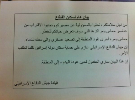أثناء العدوان الأخير، أسقطت الطائرات الإسرائيلية إعلانات ورقية على قطاع غزة تدعو فيها المدنيين إلى الابتعاد عن المواقع التابعة لفصائل المقاومة الفلسطينية وبالأخص مؤسسات حماس، وذلك تجنباً للموت. كما أن إسرائيل قامت بالترويج للإقدام على الحرب البرية ودخول قواتها لأرض القطاع منذ اليوم الأول لعدوانها، واستدعاء الاحتياط:في البداية استدعت 30 ألفاً وفي المرحلة الثانية وصل العدد إلى 75 ألفاً.