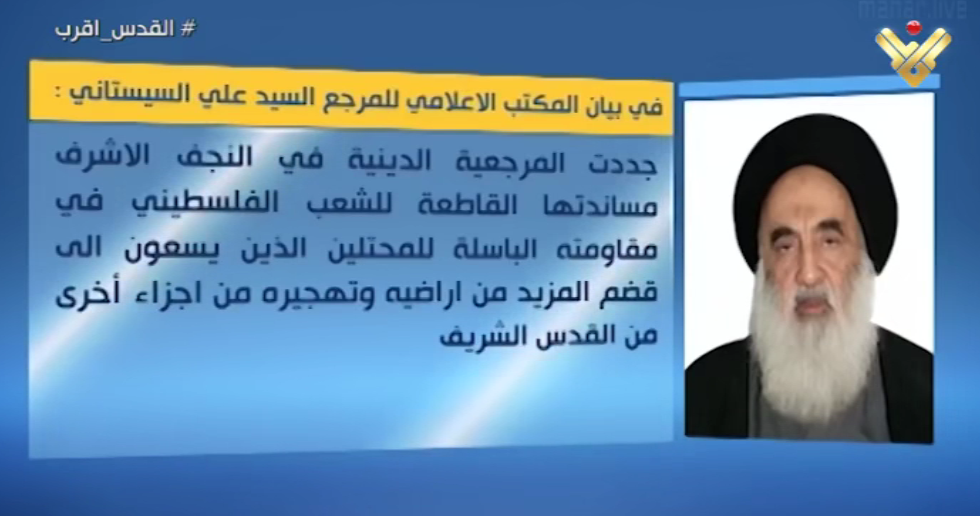 وقال البيان: تؤكد المرجعية الدينية – مرة أخرى – مساندتها القاطعة للشعب الفلسطيني الأبيّ في مقاومته الباسلة للمحتلين، الذين يسعون الى قضم المزيد من اراضيه وتهجيره من اجزاء أخرى من القدس الشريف، وتدعو الشعوب الحرة الى دعمه ونصرته في استرجاع حقوقه المسلوبة.
