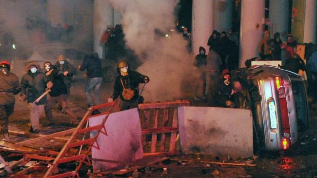 جاء ذلك بعد أن حاول مقاتلون من القوات الخاصة /بيركوت/ إزالة المتاريس التي أقامها المتظاهرون في شارع غروشيفسكي، بينما رشقهم المحتجون بالقنابل الحارقة.