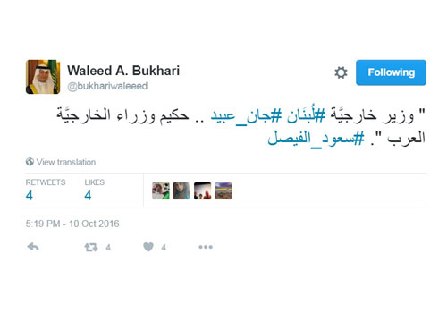 وفي ظل الموقف الملتبس والغامض للمملكة العربية السعودية حيال حركة الرئيس سعد الحريري الرئاسية وإمكان ترشيحه العماد ميشال عون، استذكر القائم بأعمال السفارة السعودية في لبنان وليد البخاري في تغريدة له كلاماً لوزير الخارجية السعودي سعود الفيصل جاء فيه: «جان عبيد حكيمنا جميعاً وحكيم وزراء الخارجية العرب».
