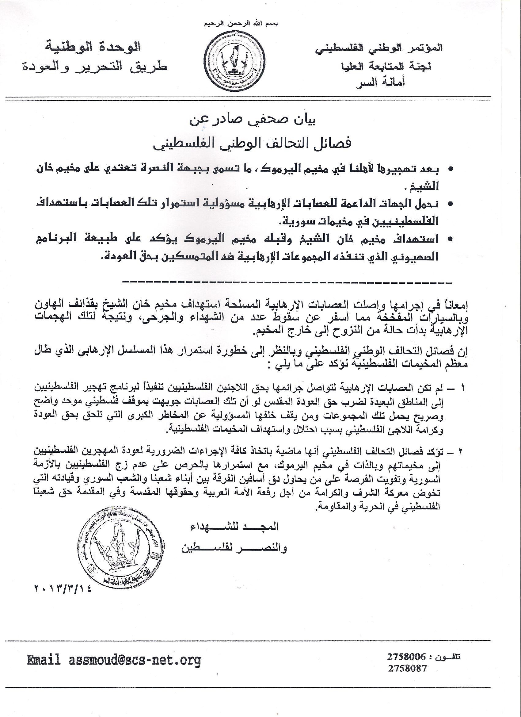 وقال البيان إن استهداف مخيم خان الشيخ وقبله مخيم اليرموك يؤكد على طبيعة البرنامج الصهيوني الذي تنفذه المجموعات الإرهابية ضد المتمسكين بحق العودة.