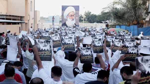 ورفع المتظاهرون صورا للمرجع البحريني الكبير آية الله الشيخ عيسى قاسم، الذي قام الملك حمد بن عيسى آل خليفة الشهر الماضي بإصدار مرسوم بتجريده من جنسيته، الأمر الذي ووجه بردود أفعال غاضبة محليا وإقليميا، فيما دانت دول بينها أمريكا القرار.