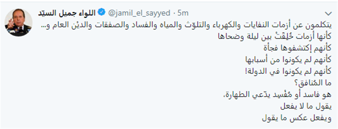 غرّد النائب اللواء جميل السيّد عبر “تويتر” يتكلمون عن أزمات النفايات والكهرباء والتلوّث والمياه والفساد والصفقات والديْن العام و… كأنها أزمات خُلِقَتْ بين ليلة وضحاها كأنهم إكتشفوها فجأة كأنهم لم يكونوا من أسبابها كأنهم لم يكونوا في الدولة! ما المُنافق؟ هو فاسد أو مُفْسِد يدّعي الطهارة، يقول ما لا يفعل ويفعل عكس ما يقول