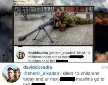 في واقعة تعبر عن مدى الوحشية الصهيونية والتبجّح بكل وقاحة بارتكاب القتل والاجرام، نقلت مواقع اخبارية ما نشره جندي اسرائيلي يدعى “دافيد دوفاديا” على حسابه الخاص على إنستغرام حيث عرض صورة له وهو يصوب بندقيته وردّ معلقا على حساب فتاة فلسطينية “قتلت اليوم 13 طفلا فلسطينيا وستلحقون بهم أيها المسلمون إلى الجحيم”. وتضمّن كلامه شتائم وكلمات نابية.