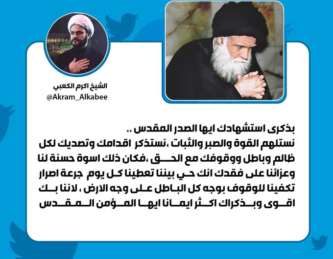 وقال الشيخ الكعبي في تغريدة على موقع التواصل ” تويتر ” ، انه ” بذكرى استشهادك ايها الصدر المقدس ، نستلهم القوة والصبر والثبات نستذكر اقدامك وتصديك لكل ظالم وباطل ووقوفك مع الحق ، فكان ذلك اسوة حسنة لنا ” .