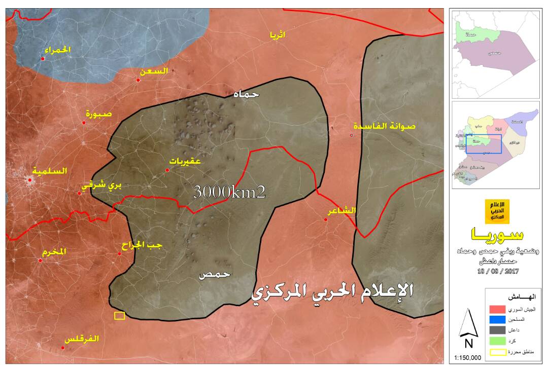 أعلن الإعلام الحربي السوري، الجمعة أن القوات المسلحة والرديفة فرضت حصاراً كاملاً على مناطق سيطرة تنظيم “داعش” في ريفي حماة وحمص الشرقيين في مساحة قدرها 3 آلاف كيلومتراً مربعاً.