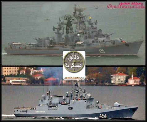 صور لبعض القطع البحرية القتالية الروسية التي عبرت مضيق البوسفور خلال الأيام الماضية في اتجاه السواحل السورية لتلتحق بالمجموعة البحرية الدائمة في البحر المتوسط و بالمجموعة القتالية لحاملة الطائرات “Admiral Kuznetsov”، من الأعلي للأسفل: