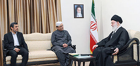والتقى زرداري الرئيس الإيراني محمود أحمدي نجاد والمرشد الأعلى آية الله علي خامنئي خلال زيارته التي استمرت يوما واحدا وتمحورت بشكل كبير حول مشروع أنبوب الغاز. ووصف خامنئي لدى استقباله زرداري مد أنبوب نقل الغاز الإيراني إلى باكستان بأنه أنموذج جيد للتعاون بين البلدين، مشيرا إلى معارضة بعض الجهات لتنمية العلاقات بين طهران وإسلام آباد، وأضاف في تصريحات نقلها تلفزيون «العالم» الإيراني: «يجب سحق هذه المعارضة وتخطيها بشكل حازم».