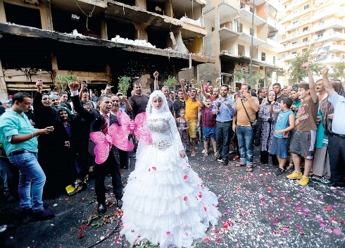 دخلت العروس فاطمة عجوز التي تزوجت اليوم من علي علاء الدين الى منطقة الرويس وتحديدا الى مكان الانفجار الذي وقع منذ 3 ايام في الضاحية الجنوبية، في خطوة اراد منها اهالي الضاحية التعبير بشتى الوسائل عن انتصار ارادة الحياة.