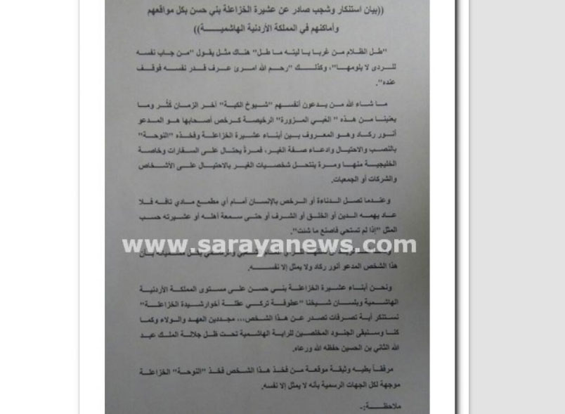 اصدرت عشيرة الخزاعلة بني حسن بكل مواقعهم في المملكة الاردنية بيان استنكار وشجب بلسان شيخ عشرتهم ‘تركي عقلة اخورشيدة الخزاعلة ‘عن قيام احد الاشخاص ويدعى انور محمد ركاد بتعريف نفسه شيخا للعشيرة امام الجهات الرسمية والسفارات والجمعيات الخيرية دون علم او صفة رسمية للتفويض بذلك .