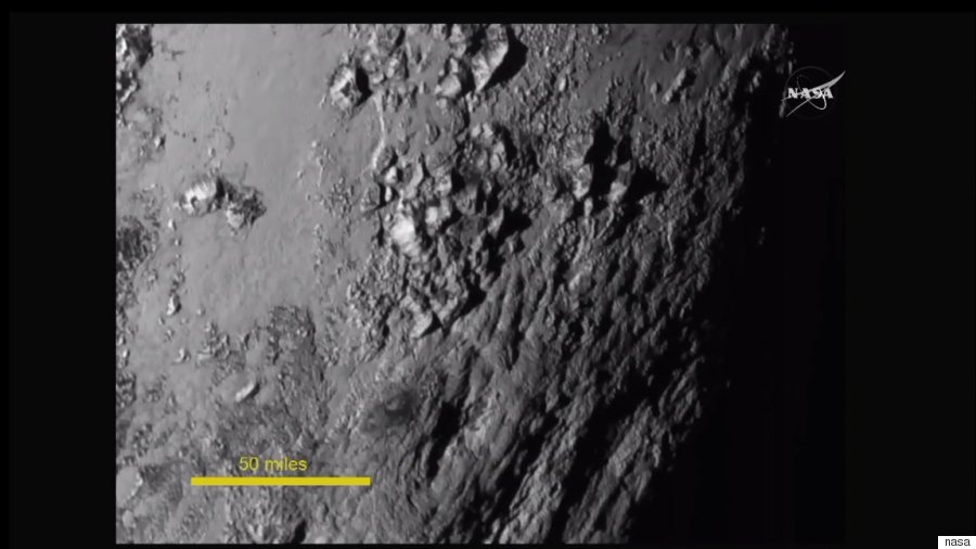 أكثر من ثماني ساعات قضاها المسبار الآلي بعد اقترابه من بلوتو، وهو يرصد الكوكب الغامض لإجراء تجارب لدراسة الغلاف الجوي له. إحدى الصور التي التقطها المسبار أظهرت بوضوح مسطحاً شهد تغيرات جيولوجية كالبراكين قبل مئة مليون سنة. وبيّنت الصورة نفسها جبالاً يبلغ ارتفاعها 11 ألف قدم على طرف المنطقة، التي تأخذ شكل قلب ما دفع العلماء إلى المقارنة بينها وبين جبال روكي الصخرية في أميركا الشمالية.