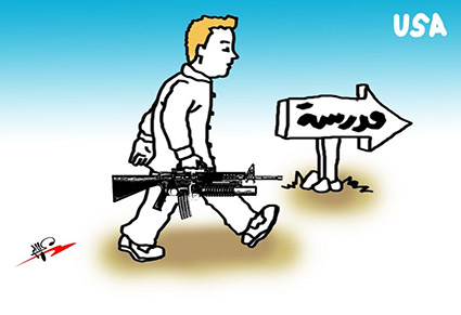 كاريكاتور للزميل عبد الحليم حمود في موقع العهد الإخباري حول المجزرة التي ارتكبها شاب أميركي في مدرة ساندي هوك في مدينة نيوتاون الأميركية