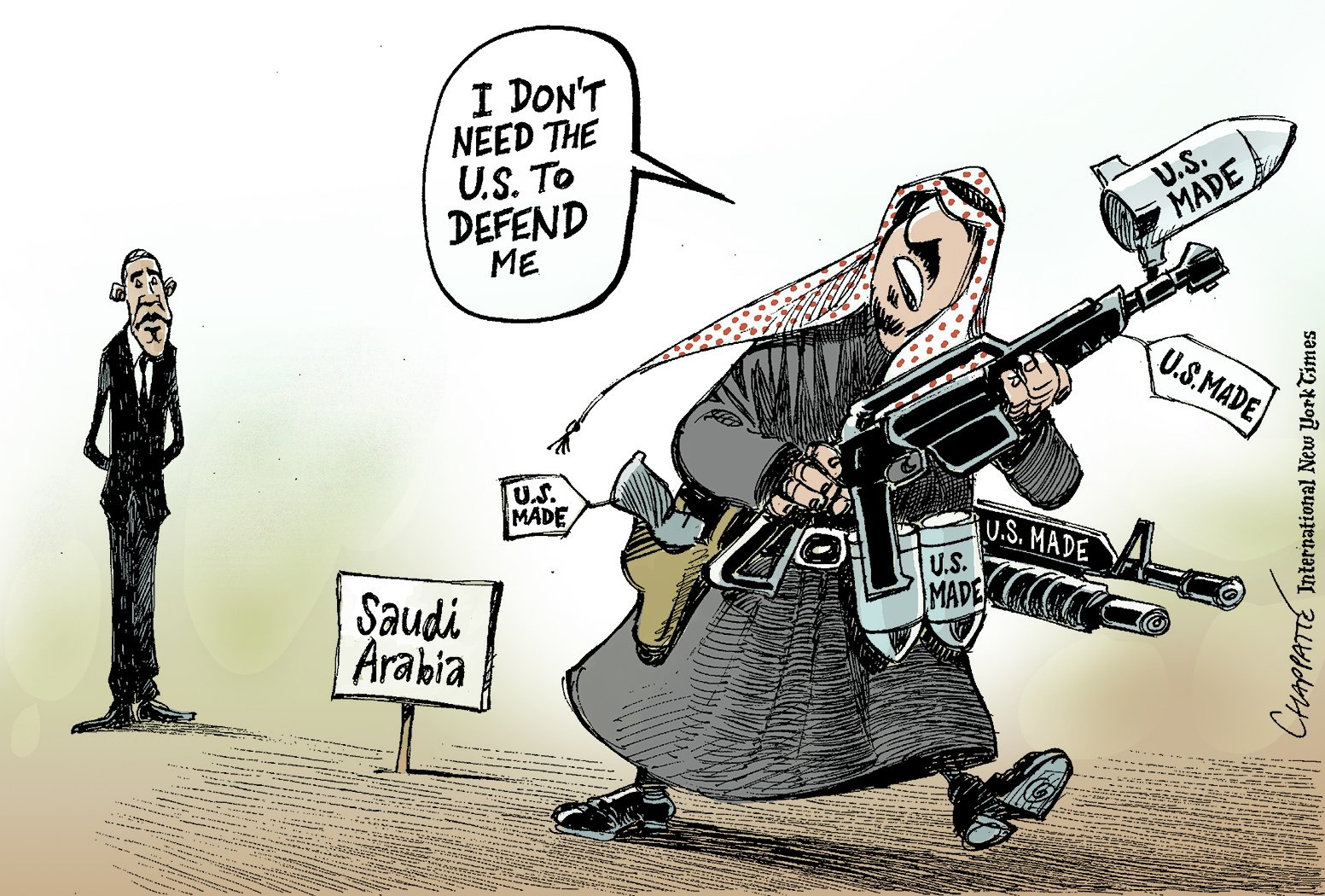 نشرت صحيفة “نيويورك تايمز” الأمريكية، كاريكاتيراً ساخراً لرسامها الكاريكاتيري “Patrick Chappatte”، جسد فيه صورة الرئيس الأمريكي باراك أوباما، الذي وقف قصياً عن الحاكم السعودي المدجج بأنواع الأسلحة الأمريكية: “صنع في أمريكا”.