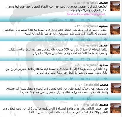 وفي سلسلة تغريدات له عبر صفحته الرسمية بموقع “تويتر”، كشف مجتهد “أن ابن نايف يزور الجزائر عدة مرات في السنة مع عدد ضخم من المرافقين، وذلك لممارسة هواية الصيد، إذ يسمح له القيام بذلك في مساحات شاسعة دون أي ضوابط لحماية البيئة”، موضحاً “أن الحكومة الجزائرية تعطي محمد بن نايف حق إفناء الحياة الفطرية في صحرائها وارتكابه مجازر بحق طائر الحباري والغزلان والوعول” مرفقا الكلام بمقطع فيديو للتدليل على ذلك.