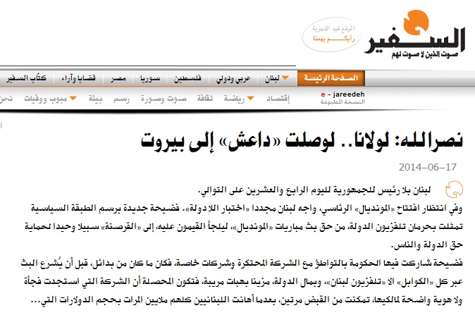 وتوقف نصرالله عند سيطرة «داعش» على الموصل ومناطق أخرى في العراق، واشاد بموقف المرجعية الدينية في النجف، معتبرا أن ما صدر عنها من دعوة لحمل السلاح بوجه الإرهابيين «ليس القصد منه حماية طائفة بعينها بل حماية العراق بأسره».