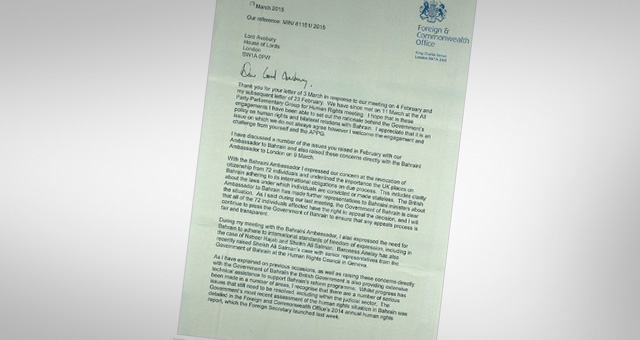 وفي رسالة إلى عضو مجلس اللوردات البريطاني اللورد إفبري مؤرخة بتاريخ 17 مارس/آذار الجاري عبر عن أمله في أن اللقاءات التي عقدت مطلع الشهر الجاري مع مجموعة من الأحزاب البرلمانية حول حقوق الإنسان أن تكون قادرة على وضع ما أسماه أساساً منطقاً لسياسة الحكومة في المجال الحقوقي والعلاقات الثنائية مع البحرين.
