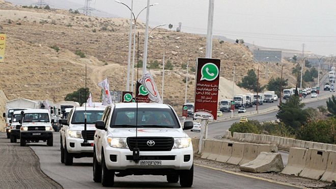 وكانت قافلة المساعدات الانسانية انطلقت من دمشق باتجاه بلدة مضايا في ريف دمشق، بالتزامن مع تحرك قافلة أخرى من السقلبية باتجاه كفرنبودة قلعة المضيق، وصولاً إلى كفريا والفوعة في ريف إدلب.