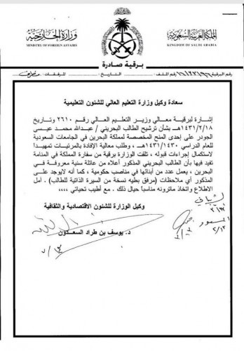 وكان وزير التربية السعودي قد طلب “الإفادة بالمرئيات تمهيدا لاستكمال إجراءات قبوله”، وهو الأمر الذي رد عليه الجانب البحريني بتحديد مذهب الطالب وعائلته.