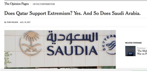 قالت صحيفة “نيويورك تايمز” الأميركية، “إذا كانت قطر داعمة للتطرف، فماذا تدعم السعودية؟”.