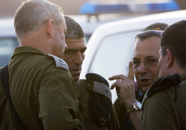 Israel's Defence Minister Barak speaks with high-ranking army personnel after a news conference near the scene of a series of attacks north of Eilat
