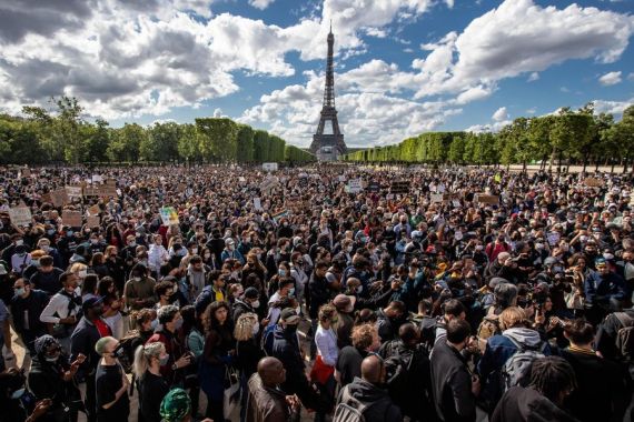 أناس يشاركون في مظاهرة في باريس بفرنسا يوم 6 يونيو 2020. واحتشد عشرات الآلاف من الأشخاص يوم السبت في باريس وعدة مدن فرنسية أخرى لتقديم التحية لجورج فلويد.