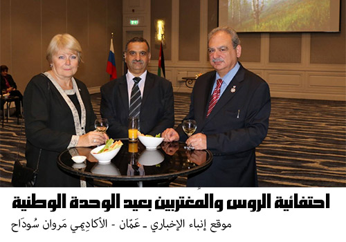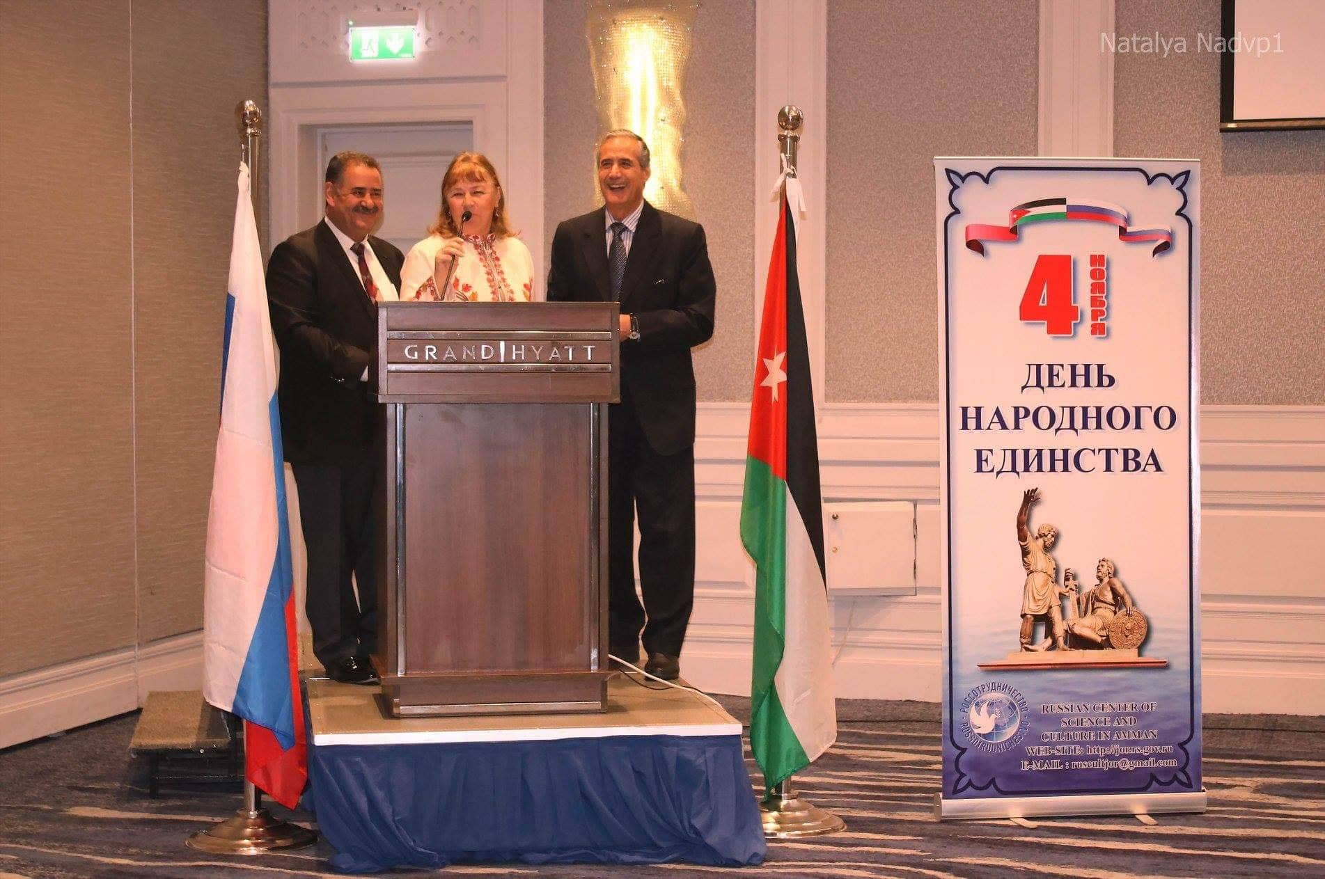 وبهذه المناسبة الوطنية والأُممية، نظّم المركز الروسي للعلوم والثقافة وجمعية مغتربي روسيا الاتحادية في الاردن، حفل استقبال مهيب في فندق غراند حياة عمّان، حضره بالإضافة الى رؤسائهما وكادرهما، عدد من دبلوماسيي سفارة روسيا الفيديرالية، ولفيف من مواطنات ومواطني روسيا في المملكة، ورؤساء وأعضاء إدارات جمعية مُغتربي روسيا الاتحادية، ونادي إبن سينا لخريجي الجامعات والمعاهد السوفييتية والروسية، وجمعية الصداقة الاردنية الروسية، وجمعية الأطباء الناطقين بالروسية، ونادي السيدات الروسيات الأردني صديقات الثقافة الروسية “ناديجدا” ، ورؤساء ونشطاء الهيئات والجمعيات الشركسية والشيشانية والداغستانية القوقازية الاردنية، وممثلون عن الجامعات الاردنية ورجال الأعمال خريجي روسيا، والصحفيين الحاملين للشهادات العلمية والتقديرية الروسية، والاتحاد الدولي للصحفيين والإعلاميّين والكتّاب العرب أصدقاء وحُلفاء الصين، ورابطة القلميّين حُلفاء روسية وغيرهم.