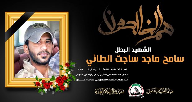 أعلنت هيئة الحشد الشعبي استشهاد أحد مقاتليها “الشهيد سامح ماجد ساجت الطائي”، وذلك “أثناء عمليات دهم وتفتيش لخلايا داعش في الموصل”. وذكر بيان الهيئة أن الشهيد “نال وسام الشهادة أثناء مطاردته فلول الإرهاب، وعرف عنه الشجاعة والإقدام والتضحية في كل المعارك التي شارك فيها ضد زمر الإرهاب”.