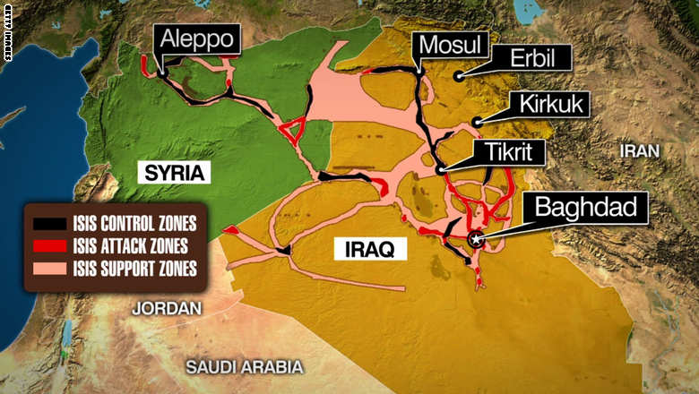 في الوقت الذي تستمر فيه الاشتباكات المتقطعة بين الجيش العراقي وبين عناصر تنظيم الدولة الإسلامية بالعراق والشام “داعش”، نشرت الـ”سي ان ان” خارطة توضح المناطق التي يتواجد فيها مسلحو التنظيم. الخارطة تظهر المدن الرئيسية في العراق بالدوائر السوداء، أما المناطق التي يسيطر عليها مسلحو “داعش” تظهر بالبقع السوداء، مناطق عمليات داعش بالبقع الحمراء، أما الخطوط البنية فتظهر مسارات الدعم والإمداد في التنظيم.