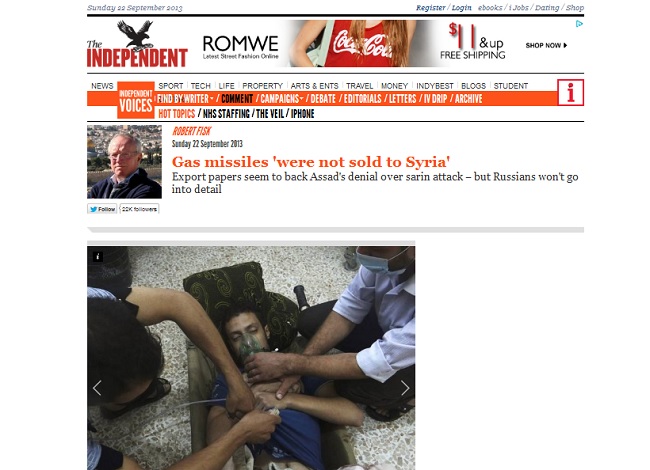 تحت عنوان “صواريخ الغاز لم تبع لسوريا” أشارت صحيفة “الإندبندنت” البريطانية إلى أنه بينما ينكر نظام الرئيس السوري بشار الأسد في دمشق مسؤوليته عن الصواريخ المعبأة بغاز السارين القاتل التي تسببت بمقتل نحو 1400 مواطن سوري في ضاحية بالغوطة في 21 من آب الماضي، فإن معلومات يتم تداولها الآن تشير إلى أن لدى روسيا “دليلا” جديدا عن الهجوم، يتضمن تواريخ تصدير صواريخ معينة استخدمت، والأكثر أهمية، البلدان التي بيعت لها أصلا.