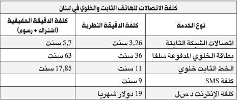 وفي النتيجة تبيّن أن كلفة العرض الأفضل في لبنان لاستعمال الخلوي بخطّ ثابت والإنترنت تبلغ 60.8 دولاراً شهرياً. أما في فرنسا، فإن العرض الأقرب إلى الحالة اللبنانية «يعطي المشترك أكثر بكثير: خطّ ثابت مفتوح، وإنترنت مفتوح وSMS بلا حدود، إضافة إلى ساعتين من الاتصال الخلوي المحلي وإلى41 بلداً أجنبياً، بنحو 2.6 دولار شهرياً (!). أما إذا كنت تريد اتصالات مفتوحة خلوية على الخط الثابت وعلى الإنترنت فهذا يكلفك، وبلا حدود وعلى مدار الساعة والأيام والشهور… 26 دولاراً شهرياً!».