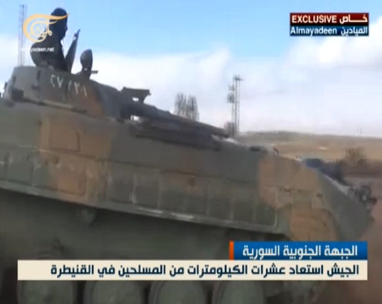 يواصل الجيش السوري عملية عسكرية واسعة في المنطقة الجنوبية وتحديداً في ريفي درعا والقنيطرة. الجيش تمكن من إحراز تقدم كبير في ريف القنيطرة كما استعاد السيطرة على عدد من القرى والبلدات في ريف درعا. وحصلت الميادين على مشاهد خاصة عن المعارك في المنطقة الجنوبية بسوريا حيث أطلق الجيش عمليات نوعية لاستعادة المناطق التي استولت عليها الجماعات المسلحة بمساندة إسرائيلية وتحديداً في ريفي درعا والقنيطرة.