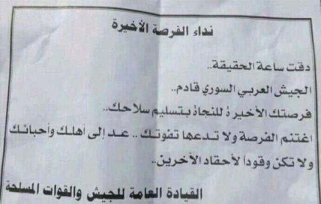 وتضمنت دعوة للمسلحين إلى اغتنام الفرصة والعودة الى أهلهم واحبائهم لأن ساعة الحقيقة دقت والجيش العربي السوري قادم الى المدينة، وحثهم المنشور على أن لا يكونوا وقوداً لأحقاد الآخرين.