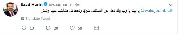 أخبار بارزةاخبار لبنان الحريري لجنبلاط: “يا ليت تحل عن المستقبل شوي” بتاريخ مايو 12, 2018 0 غرّد رئيس مجلس الوزراء سعد الحريري عبر حسابه على تويتر متوجها الى النائب وليد جنبلاط بالقول “يا ليت يا وليد بيك تحل عن المستقبل شوي وتحط كل مشاكلك علينا وشكرا”. إنباءالعربتقاريرسعد الحريريلبنانوليد جنبلاط 0 مشاركة FacebookTwitterGoogle+ReddItWhatsAppPinterestالبريد الإلكتروني