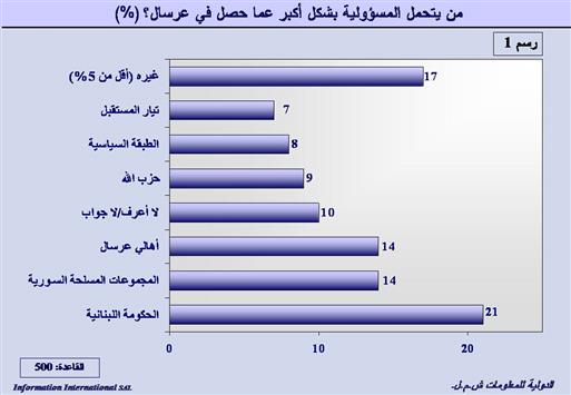 لم يجمع اللبنانيون على تحميل جهة واحدة مسؤولية ما حصل في عرسال وإن كانت أكثرية بسيطة بلغت 21% حملت الحكومة اللبنانية مسؤولية ما حصل، واعتبر 14% أن المسؤولية يتحملها أهالي عرسال والنسبة ذاتها حمّلت المسؤولية للمجموعات المسلحة السورية. وتقاربت النسب في تحميل المسؤولية لكل من «حزب الله» (9%)، الطبقة السياسية (8%) و«تيار المستقبل» (7%). وحمّلت نسبة 17% المسؤولية لجهات عدة كل منها بنسبة أقل من 5%، وأجاب 10% لا أعرف.