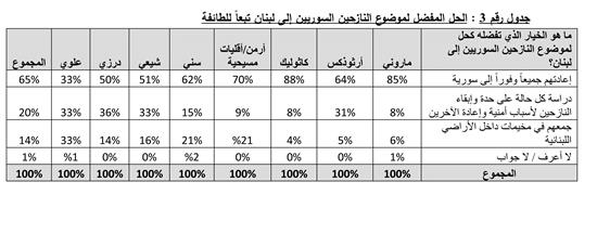 والموقف تجاه هؤلاء النازحين يشهد اختلافاً تبعاً للانتماءات الطائفية. ففيما نصف المستطلعين من الطوائف الإسلامية يطالبون بإعادة النازحين الى سورية، ترتفع هذه النسبة لدى المستطلعين من الطوائف المسيحية، وفقاً لما هو مبيّن في الجدول رقم 3.