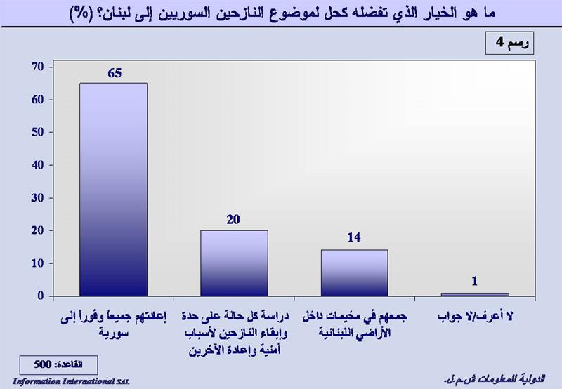 منذ اندلاع الحرب في سوريا في آذار 2011 بدأت أعداد كبيرة من السوريين بالنزوح إلى لبنان وسط تعاطف معظم اللبنانيين معهم. وقد زادت الأعداد بشكل كبير خلال الأشهر والسنوات اللاحقة فتبدل الموقف اللبناني وتبدل التعاطف في بعض الأحياء الى نقمة ورفض لهذا الوجود. وقد عبرت أكثرية 65% من المستطلعين عن موقفهم المطالب بإعادة فورية لجميع النازحين السوريين إلى بلادهم، بينما فضّل 20% دراسة كل حالة على حدة وإبقاء النازحين الهاربين لظروف الحرب وإعادة الآخرين. وفضّل 14% اعتماد خيار وضع النازحين ضمن مخيمات داخل الأراضي اللبنانية، وأجاب 1% لا اعرف.