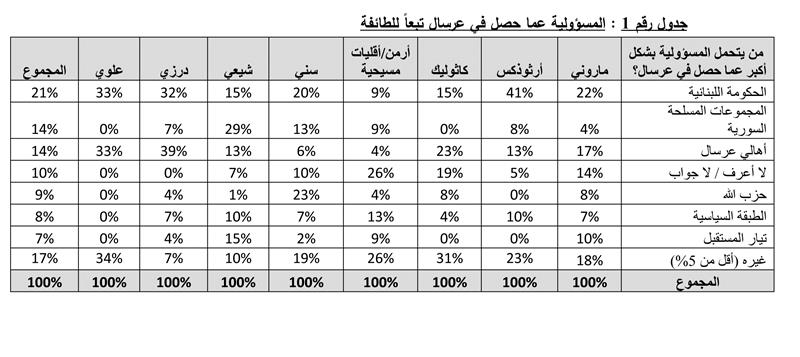 وتبعاً للطائفة، فإن أكثرية المستطلعين المسيحيين والدروز والعلويين يحمّلون المسؤولية للحكومة، بينما أكثرية 23% من المستطلعين السنة يحمّلون «حزب الله» المسؤولية وحمّلت أكثرية 29% من المستطلعين الشيعة المسؤولية للمجموعات المسلحة السورية، وفقاً لما هو مبين في الجدول رقم 1.