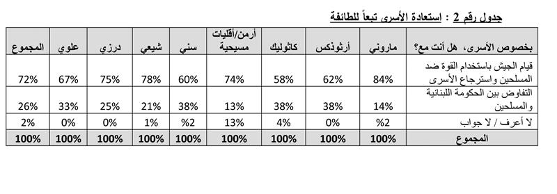 وتبعاً للطائفة، فإن أكثرية 84% من المستطلعين الموارنة و78% من المستطلعين الشيعة و75% من المستطلعين الدروز يؤيدون استخدام الجيش اللبناني القوة لاستعادة الأسرى. بينما ترتفع نسبة المؤيدين للتفاوض إلى 38% لدى كل من المستطلعين السنة، الروم الأرثوذكس والروم الكاثوليك وفقاً لما هو مبين في الجدول رقم 2.