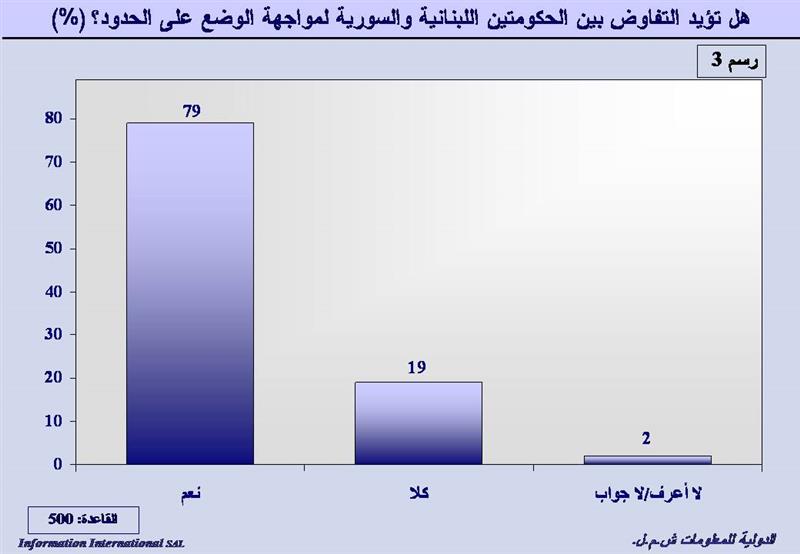 أيّدت الأكثرية الساحقة من المستطلعين (79%) التفاوض بين الحكومتين اللبنانية والسورية لمواجهة وضبط الحدود بين البلدين، بينما عارضه 19% وأجاب 2% لا أعرف.