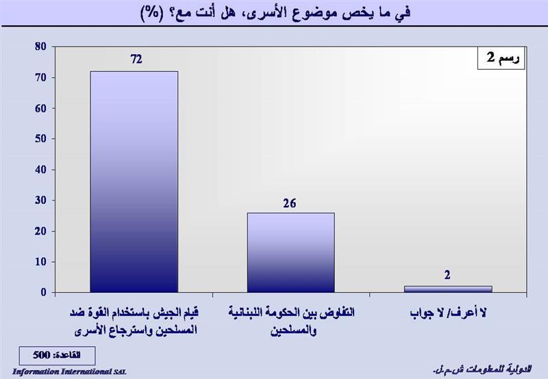 أدت المواجهات بين الجيش والمسلحين في عرسال إلى وقوع عدد من الجنود أسرى أضيفوا إلى عدد من عناصر قوى الأمن الداخلي أسروا بعد مهاجمة فصيلة درك عرسال، وقد انطلقت مفاوضات بمبادرة من «هيئة العلماء المسلمين» لاستعادتهم. لكن أكثرية 72% من المستطلعين ترفض التفاوض بين الحكومة اللبنانية والمسلحين وتطالب بقيام الجيش باستخدام القوة ضد المسلحين واستعادة الأسرى، بينما يخالفهم 26% الرأي ويؤيدون التفاوض وأجاب 2% لا أعرف.