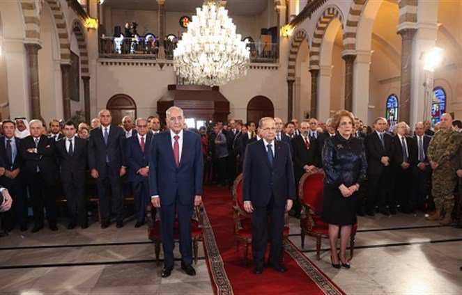 وكان الرئيس عون وصل واللبنانية الاولى الى الكنيسة، فأدت له التحية كتيبة من لواء الحرس الجمهوري، فيما عزفت موسيقى الجيش النشيد الوطني ولحن التعظيم. وعرض الرئيس عون كتيبة التشريفات، وكان في استقباله رئيس المجلس العام الماروني الوزير السابق الشيخ وديع الخازن الذي رافقه الى مدخل الكنيسة حيث رحب به البطريرك الراع، وراعي ابرشية بيروت للموارنة المطران بولس مطر ودخل الجميع وسط التراتيل الى الكنيسة التي غصت بالشخصيات الرسمية والسياسية والديبلوماسية والثقافية، وتعالى التصفيق ترحيبا بالرئيس عون والسيدة الاولى.