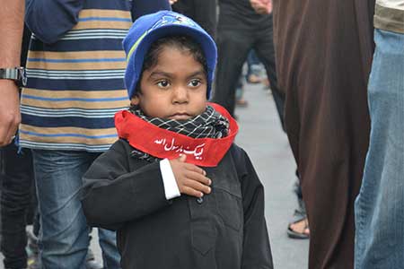 وعلت الشعارات والهتافات من المشاركين من النساء والرجال والأطفال والذين وضعوا جميعاً العصابات الحمراء والخضراء والتي حملت جميعها شعار الموكب “لبيك يامحمد”.