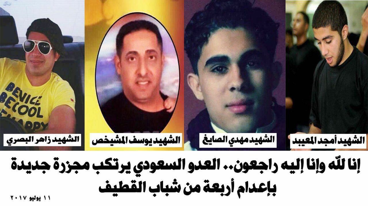 أعلنت السلطات السعودية أنها نفذت جريمة إعدام بحق أربعة من الشباب في المنطقة الشرقية، وذلك في سياق حملتها الإرهابية على المنطقة وأهلها والتي تشهد تصعيداً كبيراً في المرحلة الأخيرة.