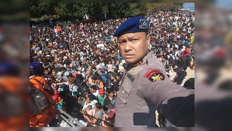 التقط رئيس شرطة البحرية لجزيرة لومبوك الإندونيسية ديوا ويجايا، صورة أمام مئات المصطافين يسارعون مغادرة شاطئ جزر جيلي خوفا من تسونامي عقب زلزل ضرب البلاد.