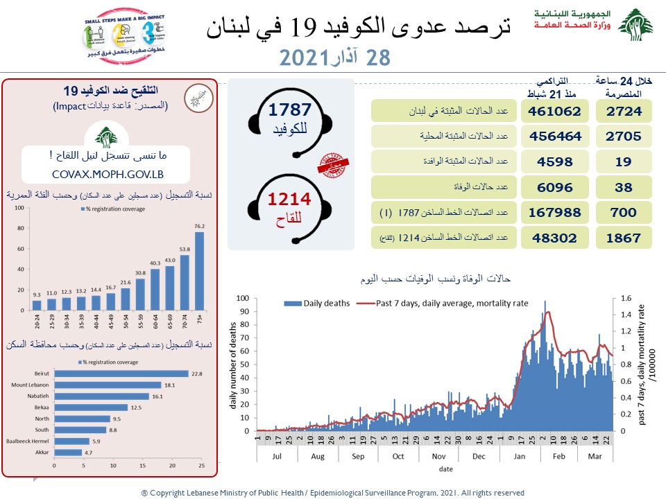 أعلنت ​وزارة الصحة العامة​ في تقريرها اليومي، “تسجيل 2724 حالة جديدة مُصابة بفيروس “كورونا” المستجد (​كوفيد 19​) خلال الـ24 ساعة الماضية، ليرتفع العدد التراكمي للإصابات منذ 21 شباط 2020 إلى 461.062 حالة”.