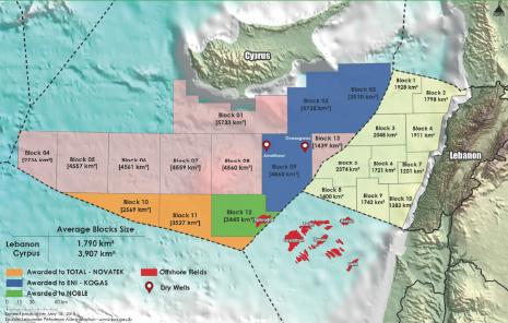 في قبرص تعمل كلٌّ من ENI في البلوكات 2 و3 و9، Nobel Energy الأميركيّة في البلوك 12، حيث حقل أفروديت الذي يحوي نحو 5 تريليون قدم مكعّب، وTotal الفرنسيّة في البلوك 11، حيث تشير المسوح إلى وجود كميّات هائلة من الغاز. أخيراً افتتحت قبرص دورة مناقصة ثالثة على ثلاثة بلوكات جديدة (6-8-10)، فالجزيرة المتوسطيّة تطمح إلى أن تصبح مركزاً إقليمياً لتسييل غازها الطبيعي واحتياطات إسرائيل ولبنان، وتصديرها.