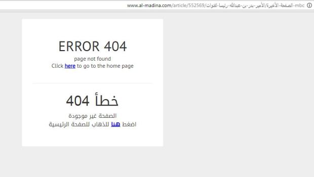 وبالبحث عن اسم الأمير بدر بن عبدالله آل سعود وصحيفة “المدينة” على “غوغل” يظهر رابطان يحملان عنوان “الأمير بدر بن عبدالله رئيساً لقنوات mbc”، ولكن بالدخول عليهما تظهر عبارة “خطأ 404.. الصفحة غير موجودة”، وفق ما ذكر موقع “مصراوي” الإلكتروني.