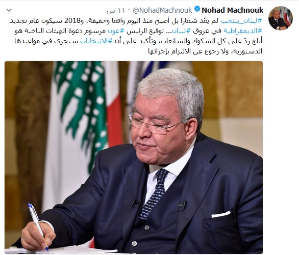 غرد وزير الداخلية والبلديات نهاد المشنوق عبر “تويتر”، معلقا على توقيع رئيس الجمهورية العماد ميشال عون مرسوم دعوة الهيئات الناخبة، فكتب التالي: “لبنان ينتخب” لم يعد شعارا بل أصبح منذ اليوم واقعا وحقيقة، والعام 2018 سيكون عام تجديد الديمقراطية في عروق لبنان. توقيع رئيس الجمهورية العماد ميشال عون مرسوم دعوة الهيئات الناخبة هو أبلغ رد على كل الشكوك والشائعات، وتأكيد على أن الانتخابات ستجري في مواعيدها الدستورية، وأن لا رجوع عن الالتزام بإجرائها”.
